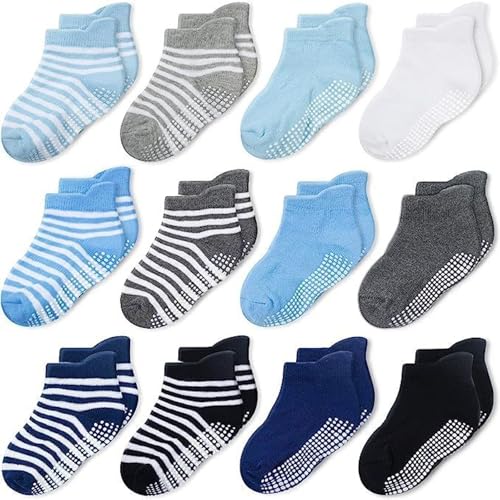 CozyWay Baby halkfria strumpor småbarn strumpor med grepp ankel för spädbarn barn små flickor pojkar, Pojkar randiga och solida 12 par, 1-3T