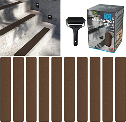 cocofy Halkskyddstejp För Trappor Inomhus och Utomhus | 10x Halkskydd (61x10 cm) Brun| Starkt Fäste | Halkskydd För Trappor | Med Monteringsroller