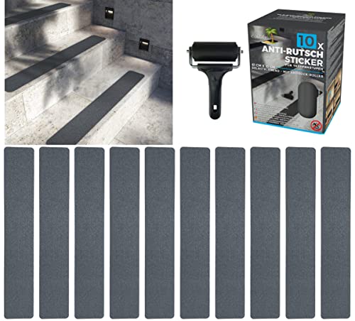 Cocofy Halkfria ränder trappor utomhus och inomhus, 10 x ränder (90 x 15 cm) grå, starkt grepp tack vare speciell utomhusyta, halkskydd för trappsteg, halkfria, trappmattor utomhus, grå