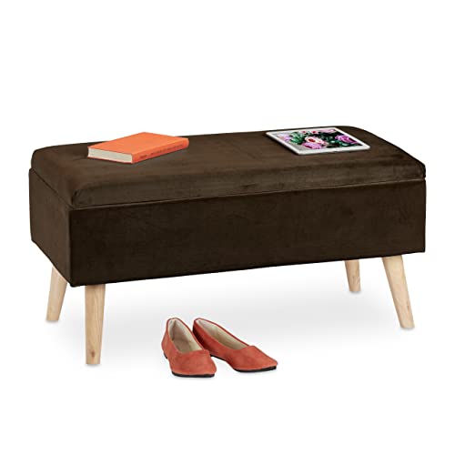 Relaxdays Bänk med förvaringsutrymme, sammetsöverdrag, 40 l, vadderade, träben, hall, 2 byråbänk, 41 x 80 x 40 cm, brun