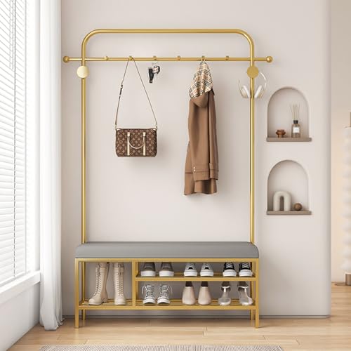 Elegant guldentré hallträd med bänk, 2-nivåers skoorganisatör, 6 krokar och metallram, hörnklädställ förvaringshylla för ytterdörr, hall, 80 cm