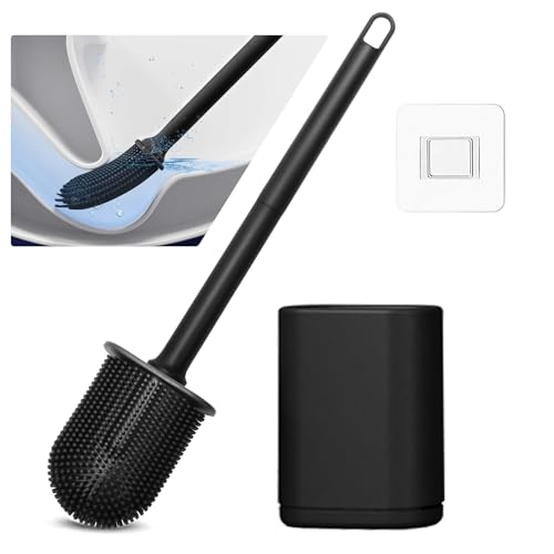 JIMACRO Mjuk toalettborste silikon långt handtag djuprengörare toalettborstar och hållare för badrum, golv/väggmonterad mjuk borst toalettborste, svart