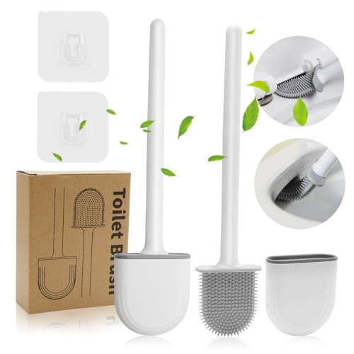 Toalettborste i silikon, 2-pack toalettborstar och hållare Loo badrum platt flexibel toalettborste, droppfri väggmonterad toalettrengöringsborste rörlig borst för hörnrengöring (gråvit)