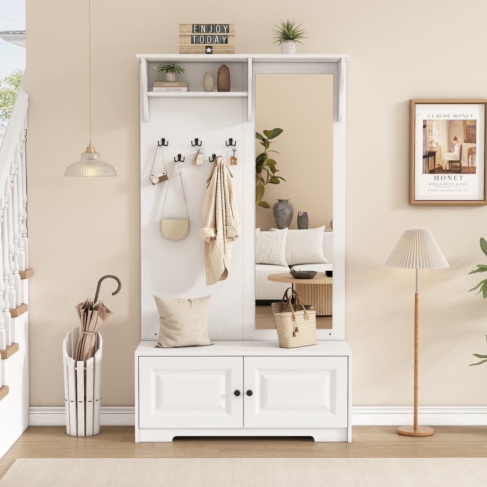 Garderob med spegel, 5 klädhakar, 2 skåp och hylla, kompakt hallgarderob med skohyllor, vit