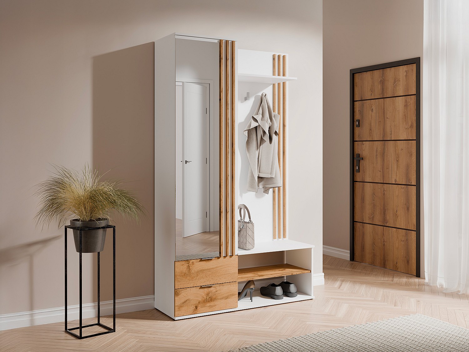 Hallmöbel med spegel och förvaring - Vit och Natur - JANAKIA
