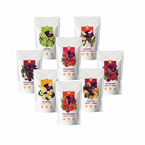 NutriBoom Snackbox med frystorkad frukt, bär och grönsaker (8 packs). Hälsosamma snacks (frystorkade: banan, äpplen, jordgubbar, hallon, björnbär, rödbetor, plommon, kiwi), naturliga, veganskt och glutenfritt mellanmål
