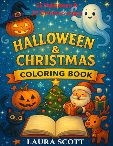 Halloween & Christmas Coloring Book for Kids: 50 Fun Pages to Color - 25 Halloween + 25 Christmas Designs - Pumpkins, Ghosts, Witches, Santa, Reindeer & More! Holiday Coloring Book for Kids Ages 4-10