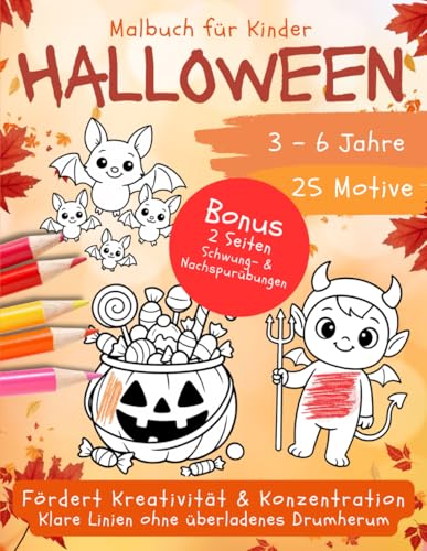 Malbuch für Kinder Halloween: 25 Motive zum Ausmalen für Kinder von 3 bis 6 Jahren | Mit Bonus: 2 Seiten Schwung- & Nachspurübungen | Fördert Kreativität & Konzentration
