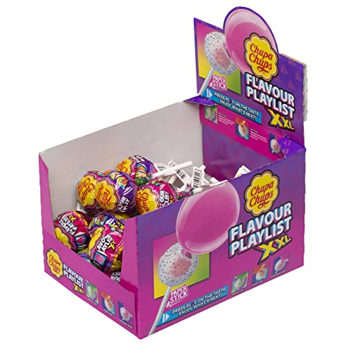 Chupa Chups XXL Flavour spellista tuggummiklubbor, diskdisplay innehåller 25 klubbor med fruktig tuggummikärna i 3 läckra sorter, för halloween, 25 x 30 g