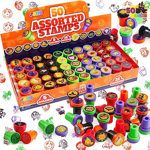 JOYIN 50 stycken halloween blandade frimärken för barn självbläckstämplar (25 olika mönster, plaststämplar, bus eller godis, läskiga frimärken) för halloween festpåse, fyllning, halloween godisväskor
