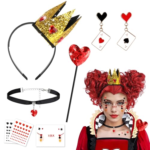 Beipegin 7 st Hjärtan Tillbehörsset, Krona Pannband Örhänge Halsband Stav Ansikte Klistermärken, Drottning av Hjärtan Kostym Accessoarer Kvinnor Flickor för Halloween Karneval VärldsBok Dag Cosplay