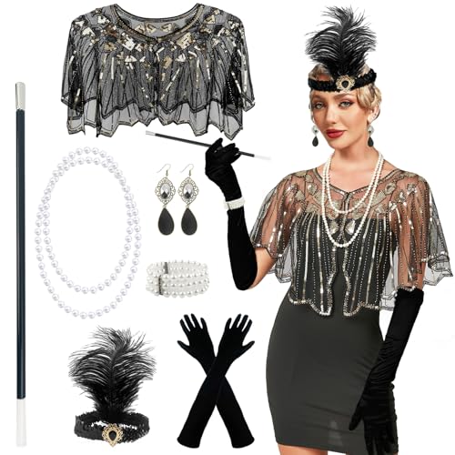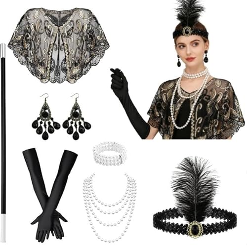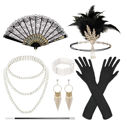 RosyFate Accessoarer för 20-talet, dam, 9 st 20-talsdräkt dam, tillbehör till 20-talet, Great Gatsby, med huvudbonader för 20-talets fest, halloween, maskerad