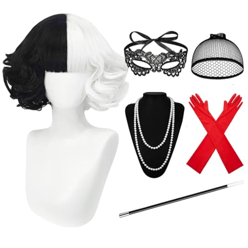 HIQE-FL Halloween Cruella peruk svart och vit, Cruella Halloweenkostym, cosplay peruker accessoarer, 70-tals tillbehör, med spets mask, pärlhandskar, smycken, Halloween Mardi Gras, V-formad