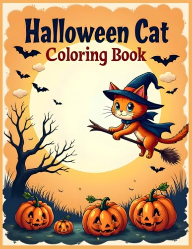 Halloween Cat Coloring Book: Cartoon Cats as Witches Flying on Broomsticks, Pumpkin Patch Scenes Coloring Pages for Stress Relief