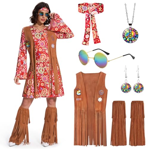 Ulikey Hippie-dräkt dam, hippie-kläder dam, 70-talsklänning slagarrörelse, outfit dam med fransväst, stövelöverdrag för karneval, halloween, cosplay (röd, L)