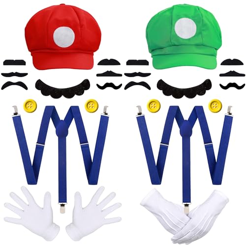 iZoeL Maskeraddräkt Mario-keps, Luigi-keps, halloween, Mario, hängslen 4 handskar 14 mustascher 4 knappar, cosplay, karneval, dräkt, barn, herr, dam