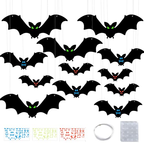 Halloween hängande fladdermöss dekoration, Ompinda 12 st svart flygande fladdermus med lysande ögon klistermärke skrämmande dekor för att hänga i trädet, veranda, gräsmatta, inomhusvägg