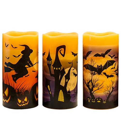 Eldnacele Halloween flamlösa pelarljus med 6H timer, batteridrivna äkta vax LED ljus med fladdermöss, slott, häxmönster för skräck läskig halloween dekoration presentpaket med 3