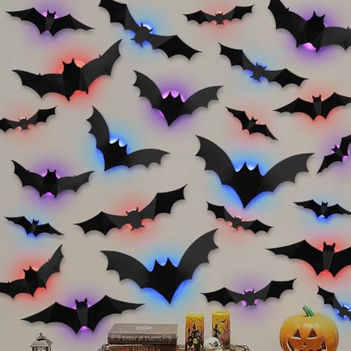 Halloweendekoration, 24 stycken LED-fladdermusdekoration, 3D fladdermus väggklistermärken, halloweendekoration LED fladdermuslampor, halloween fladdermus för fönsterdekoration, sovrum, utomhus