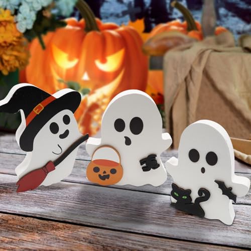 3 stycken halloween spökfigurer dekoration, halloween dekoration interiör spökdekoration, unik halloween spöke katt fladdermus av trä, för halloweenfester, bordsdekoration, inredning