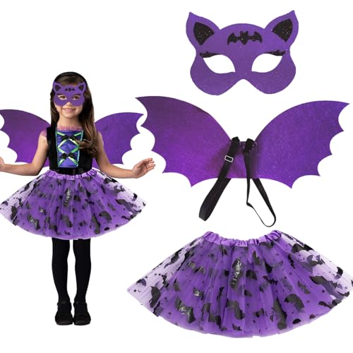 Giugio Halloween fladdermus kostym barn, lila halloween mask set flicka med vingar tutu fladdermusklänning, fladdermus häxor djävul barnkostym för karneval temafest halloween cosplay fest