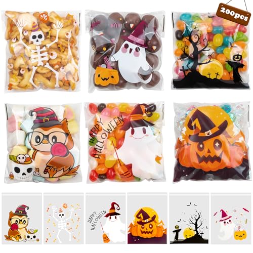 RICEDUO 200 st halloween godispåsar, självhäftande genomskinliga kakpåsar, cellofanplast presentpåsar för halloween festtillbehör, hemmagjorda hantverk och snacks presentförpackning (6 stilar)