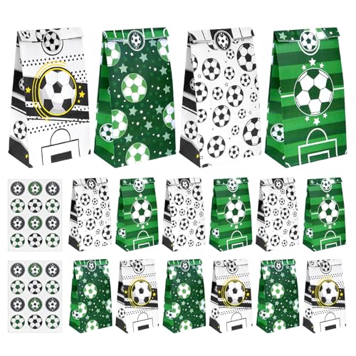 YIMETOP 16 stycken fotbollspapperspåsar presentpåsar med 24 klistermärken – fotbollsfestpåsar för födelsedag, halloween och evenemang – godispåsar, motivväskor för barn, sportfest