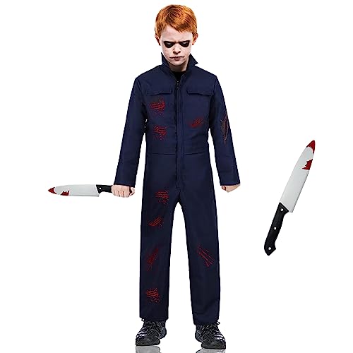 Halloween Michael Myers kostym barn: 2-pack karneval halloween killer film skräck cosplay kostym och blodsmörjd kniv barnoverall kostym karneval temafest arbetsoveraller (M,7–10 år)