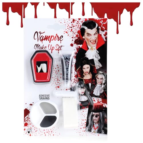 COM-FOUR® 5-delad Halloween sminkset - tillbehör till vampyrdräkter med vampyrtänder, falskt blod, svamp, självhäftande pärlor och sminkpalett