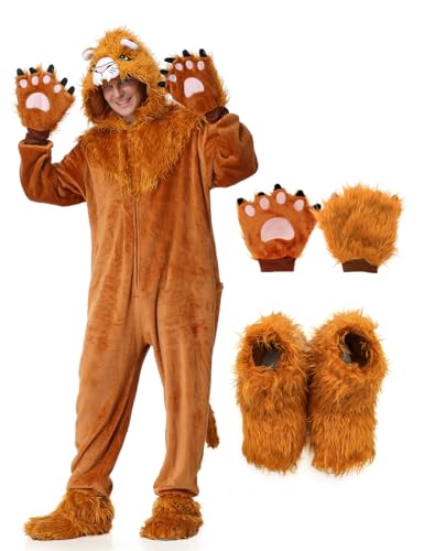 IKUKI Lejon Kostym Vuxen Djur OnePiece Unisex Lejon Pyjamas Halloween Party Onesie Cosplay Klä Upp Kostym För Män Kvinnor, Brungul, XL