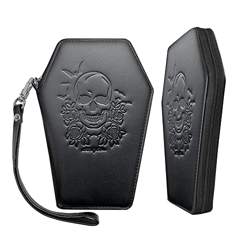 Lazy Skull Zip Around Coffin Wallet – söt häxa plånbok för kvinnor med skalle och fladdermus design – gotisk tillbehörsplånbok – skräck kistapåse – läskig halloween gotisk plånbok med handledsrem,