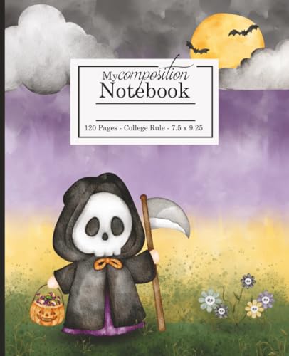 Watercolor Grim Reaper Trick-or-Treater Composition Notebook - College Rule - 7.5 x 9.25 - Halloween - Pumpkins - Skull Flowers