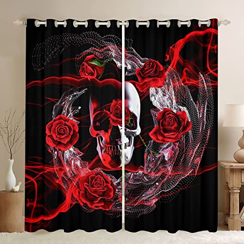 Sugar Skull mörkläggningsgardiner (30 % – 50 %) 3D ros gotisk dödskalle gardin röd blommig halloween mörknande fönsterdrömmar för sovrum rök röda fönsterbehandlingar W66 * L 72