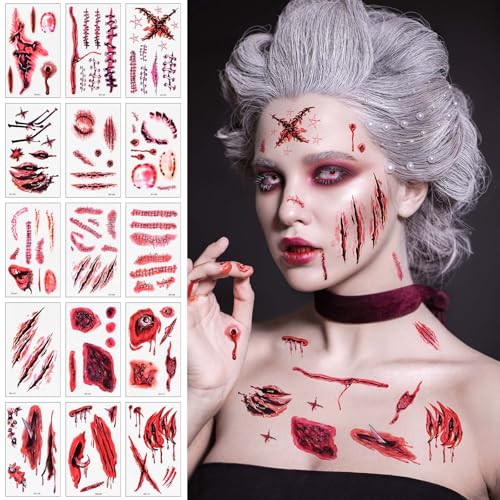 Alaoo Halloween sårklistermärken, 15 ark halloween ärr tatuering, realistisk skräck tillfällig tatuering för barn och vuxna, halloween, cosplay, smink A