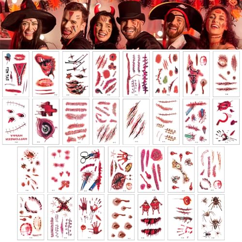 Alaoo Halloween sårklistermärken, 30 ark halloween ärr tatuering, realistisk skräck tillfällig tatuering för barn och vuxna, halloween, cosplay, smink A