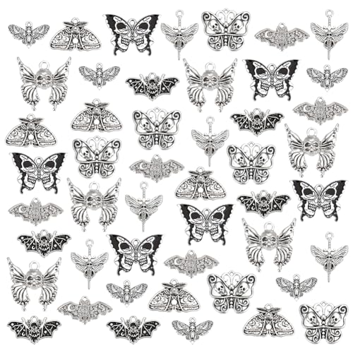 PH PandaHall 48 st gotiska nattfjärilsberlocker halloween skelett huvud charm, 8 stilar antik silver fladdermus fjäril berlock för gör-det-själv smycken, Metall, Ingen ädelsten