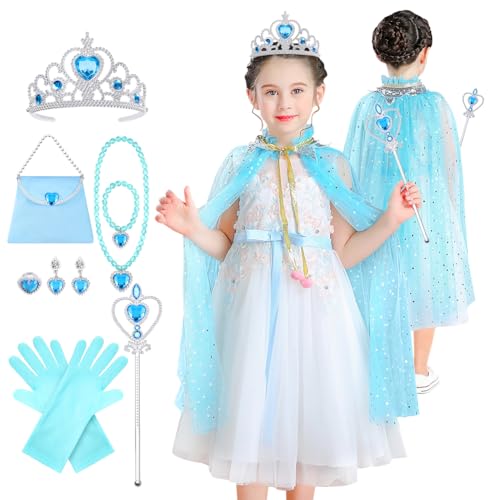 Aomig Princess Cape Set, 11 st utklädningskläder för små flickor, med cape, krona, trollspön, smycken, väska, handskar, utklädningsdräkt leksaker gåvor för halloween födelsedagsfest cosplay, åldrar 3+