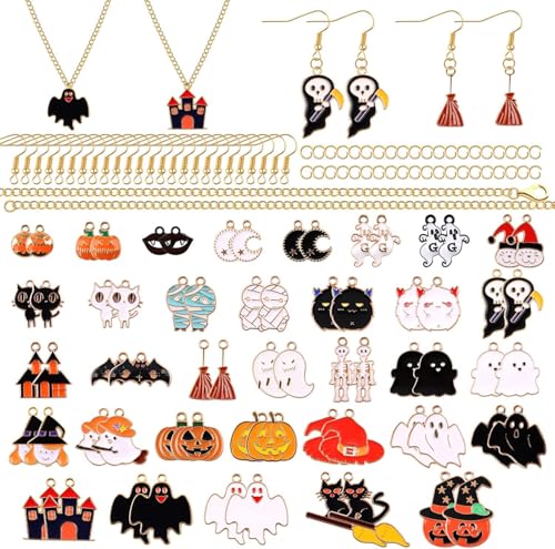 70 ST Halloween Berlocker för smyckestillverkning, EBANKU Aloy Berlocker Hänge med 100 STK öronkrok och 5 ST Halsband Pumpa Spökprydnad för smycken Armband Halsband Hantverk