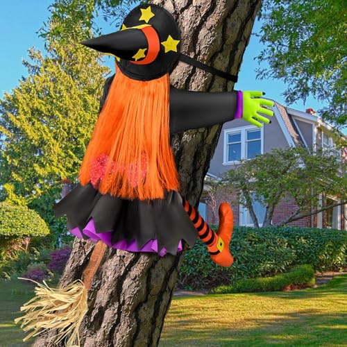 POPGIFTU Halloween utomhusdekorationer häxa - 135 cm stor flygande häxa fastnat i ett träd, halloween hängande för gård, trädgård, veranda, dörr