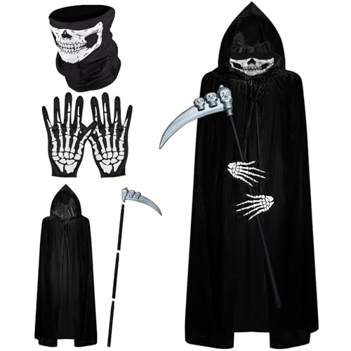 SOETDERT Liemannendräkt, halloweendräkt med lie, dödskallemask, mantel, handskar, halloweenutklädnad, liemannenkostym för barn på halloween, karneval och maskerad
