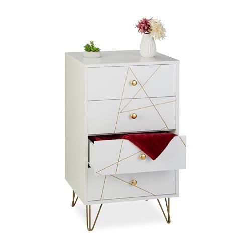 Relaxdays Byrå HxB x D: 86 x 48 x 39 cm 4 lådor MDF, järn, vardagsrum, sovrum, hallskåp, byrå, vit/guld