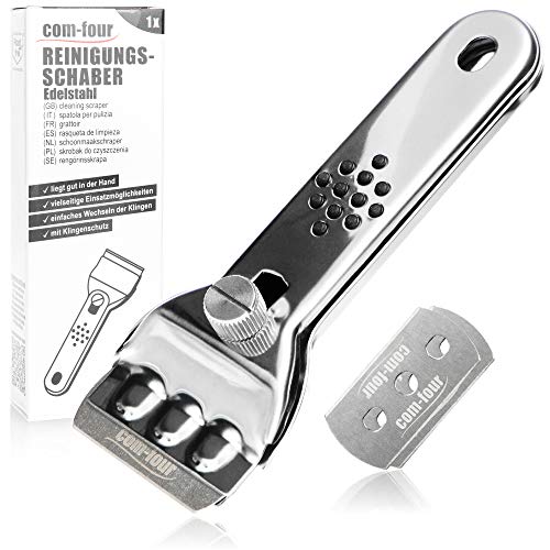 COM-FOUR® Ceran fältskrapa med ersättningsblad - Skrapa av rostfritt rostfritt stål för köket - Ceran fältskrapa med halkfritt handtag och bladskydd - Hällskrapa (01 st + 02 blad)