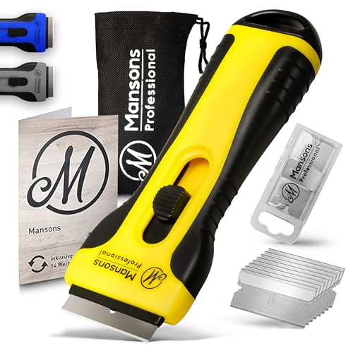 Mansons Professionell keramisk hällskrapa – din pålitliga skrapa för kök och hushåll – stabil hällskrapa med mjukt handtag – 15 ersättningsblad integrerade i glasskrapa (Gul)