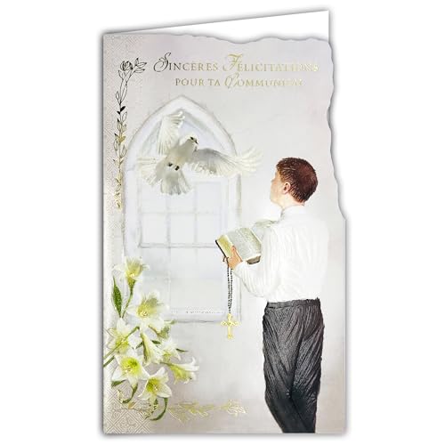 19-649 kort med kuvert uppriktiga grattis kommunion pojke kristna kors katolska radband vår far jag hälsar dig bibel öppen duva blommor vita liljor - tillverkad i Europa