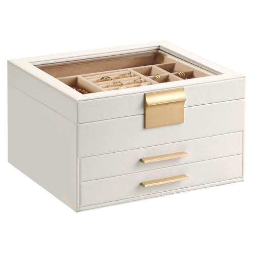 Vlando Smyckeskrin för kvinnor, glaslock, smyckesorganisatör med 3 lådor för halsband, ringar, örhängen, armband, mors dag, present till mamma – molnvit