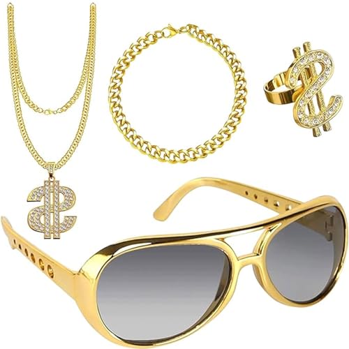 4 stycken dollar kedja set, dollar tecken halsband ringar solglasögon guldkedja set, hip hop kostym set, karneval accessoarer, hiphop-smycken för 80/90-talet män karneval fest, Large, Metall