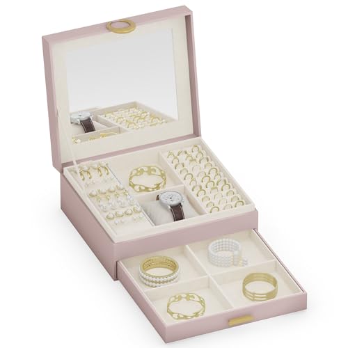 ADEL DREAM Smyckeskrin med 2 våningar med utdragbar bricka smyckesorganisatör med stor spegel med gör-det-själv-struktur, för halsband, ringar, örhängen, mödrar och flickor (rosa-12-7)