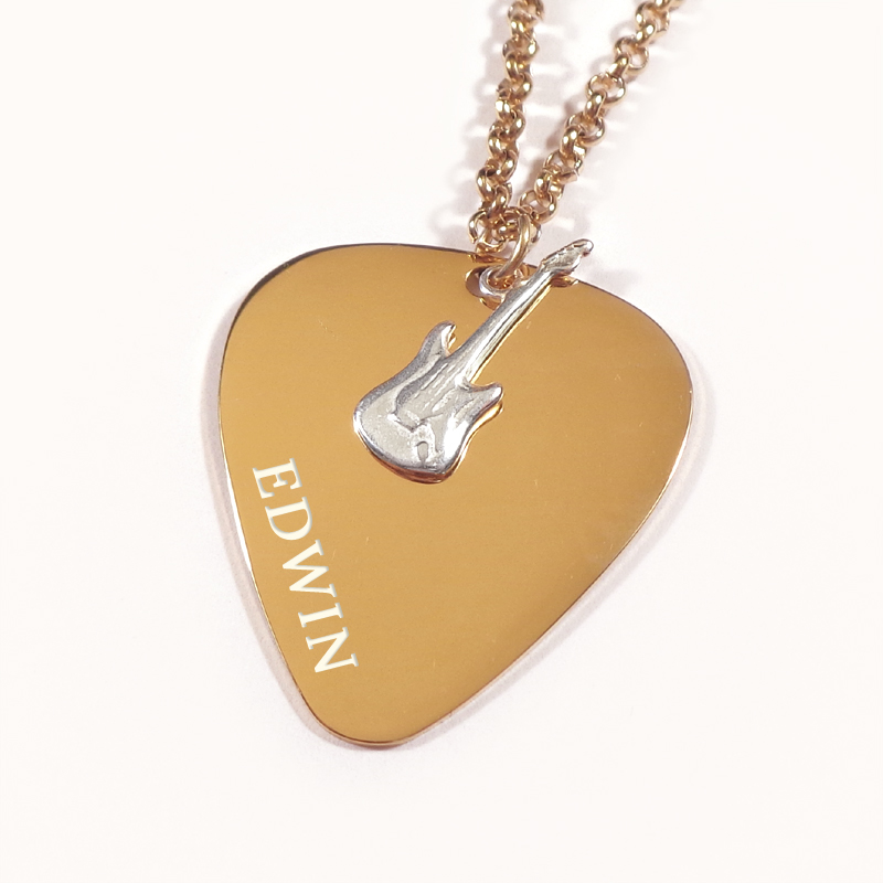 Guld plektrum med gitarr, Halsband med gravyr - Rostfritt stål