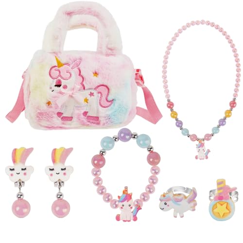 OSDUE Enhörningsväska, leksak, smycken, barn, flickor, smycken, småflickor, plyschväskor, halsband, armband, örhängen, ringar, kit, present, 2–7 år