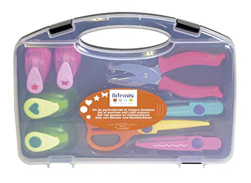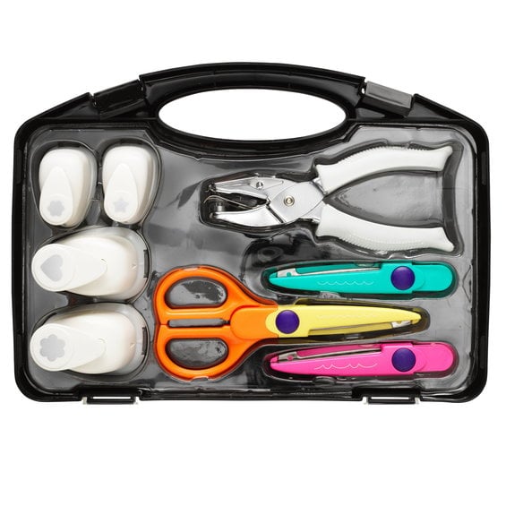 Praktiskt kit med figurstansar, mönstersaxar och håltagare för konfetti